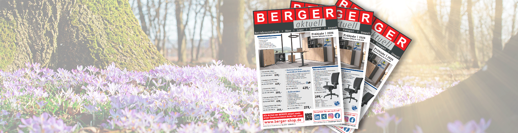 Mit dem Frühling beginnt die Zeit für Erneuerung und frische Struktur in Ihrem Betrieb. In der neuen BERGER aktuell Frühjahr präsentieren wir Ihnen gezielte Angebote, die modernes Arbeiten im Innenbereich mit funktionaler Infrastruktur im Außenbereich vereinen. Optimieren Sie Ihre Bürowelten durch ergonomische Schreibtische, komfortable Bürostühle und blendfreie Tischleuchten, die zusammen mit Akustik-Stellwänden für konzentriertes Arbeiten sorgen. Modulare Schrankwandsysteme und flexible Rollcontainer schaffen dabei den nötigen Stauraum für maximale Ordnung.