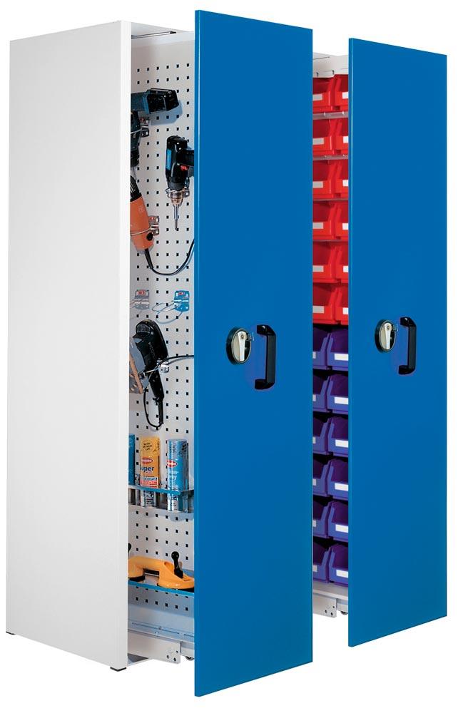Auszugschrank, 2 Vertikalauszüge mit je 1xLoch- Schlitzplatte, BxTxH 1100x600x2000 mm, RAL 7035/5010