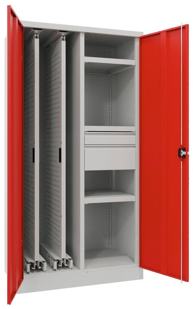 Vertikalauszugschrank, 2 Auszüge mit Lochplatten, Mitteltrennwand, 3 Böden, 2 Schubladen (1x100 mm, 1x200 mm), BxTxH 1000x600x1950 mm, RAL 7035/3000