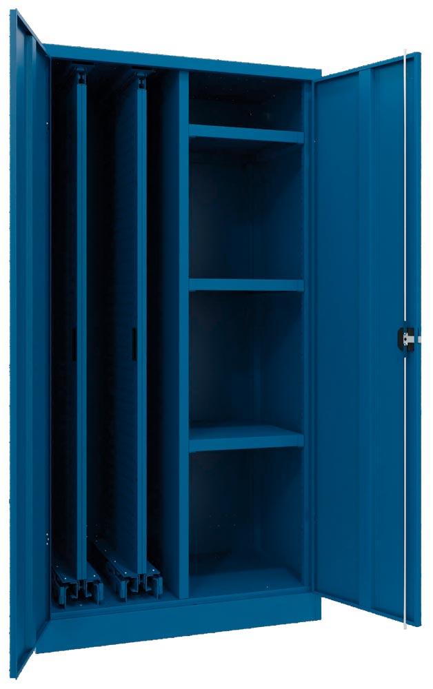 Vertikalauszugschrank, 2 Auszüge mit Lochplatten, Mitteltrennwand, 3 Böden, BxTxH 1000x600x1950 mm, RAL 5010