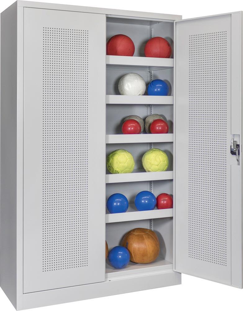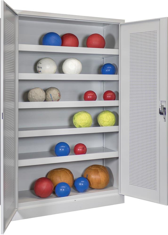 Die hier angebotenen Schränke sind in Deutschland hergestellte Metallschränke die insbesondere in Sportvereine und Sporthallen z. B. in Schulen und Kindergärten zum Einsatz kommen. Die Einlegeböden mit Aufkantung als Abrollsicherung sind geeignet für die Aufbewahrung von Bällen und anderen Sport- und Unterrichtsmaterialien.