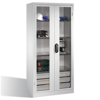 C+P Großraum Werkzeugschrank, Sichtfenstertüren, 4 Fachböden, 3 Schubladen unten, Farbe lichtgrau, 1.950 x 930 x 500 (HxBxT)