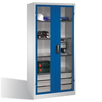 C+P Großraum Werkzeugschrank, Sichtfenstertüren, 4 Fachböden, 3 Schubladen unten, Farbe lichtgrau/enzianblau, 1.950 x 1.200 x 500 (HxBxT)