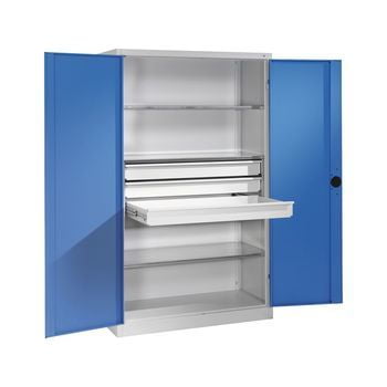 C+P Schwerlastschrank Werkzeugschrank Maschinenschrank, 4 Fachböden, 3 Schubladen mittig, Farbe lichtgrau/lichtblau, 1.950 x 1.200 x 500 (HxBxT)