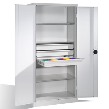 C+P Schwerlastschrank Werkzeugschrank Maschinenschrank, 4 Fachböden, 3 Schubladen mittig, Farbe lichtgrau/lichtblau, 1.950 x 930 x 600 (HxBxT)