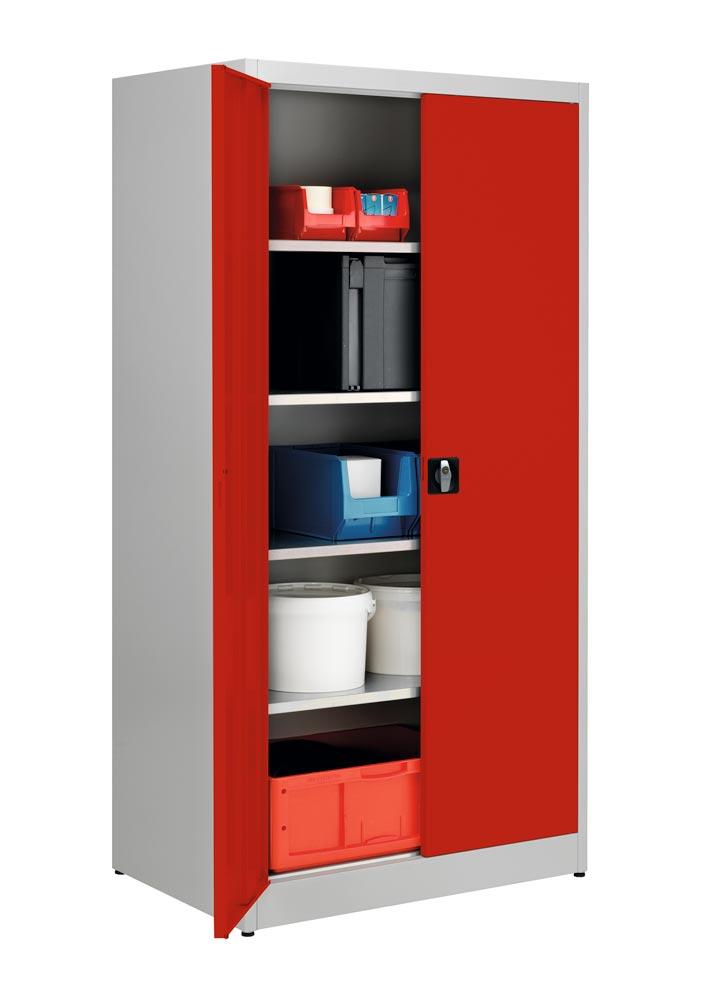 • Stabiler, verschweißter Stahlkorpus mit hochwertiger Pulverbeschichtung • Korpus in RAL 7035 lichtgrau beschichtet • Dreiriegelverschluss mit Drehzylinder- schloss inkl. 2 Schlüssel • Verwindungsfeste Türen mit Kastenversteifung, Türöffnungswinkel 135°