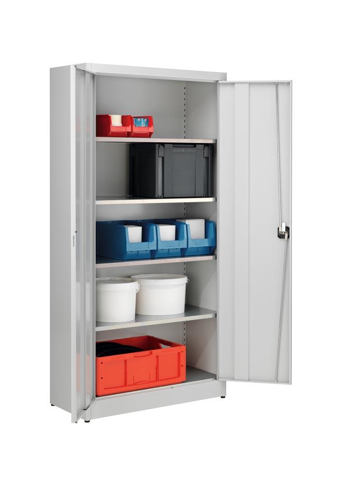 Flügeltürenschrank, 4 verzinkte Fachböden, FachbödenBxTxH 950x420x1965 mm, RAL7035