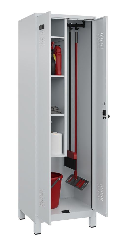 Putzmittelschrank Premium Plus, BxTxH 600x500x1950 mm, 2 Abteile a 300 mm, mit Füßen, Drehriegel, RAL 7035