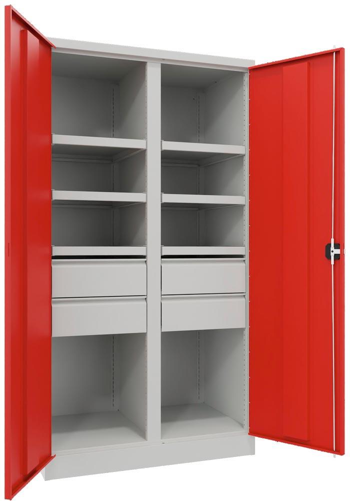 Schwerlastschrank, Vollblechtüren, m. Trennwand, 6 Böden, 200 kg Traglast, 4 Schubl. 175 mm, BxTxH 1040x630x1950 mm, RAL 7035/3000