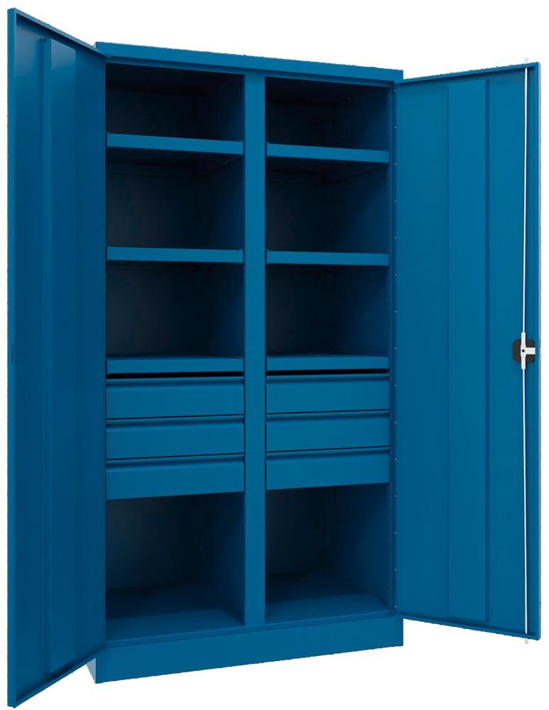 Schwerlastschrank, Vollblechtüren, m. Trennwand, 6 Böden, 200 kg Traglast, 6 Schubl. 125 mm, BxTxH 1040x630x1950 mm, RAL 5010
