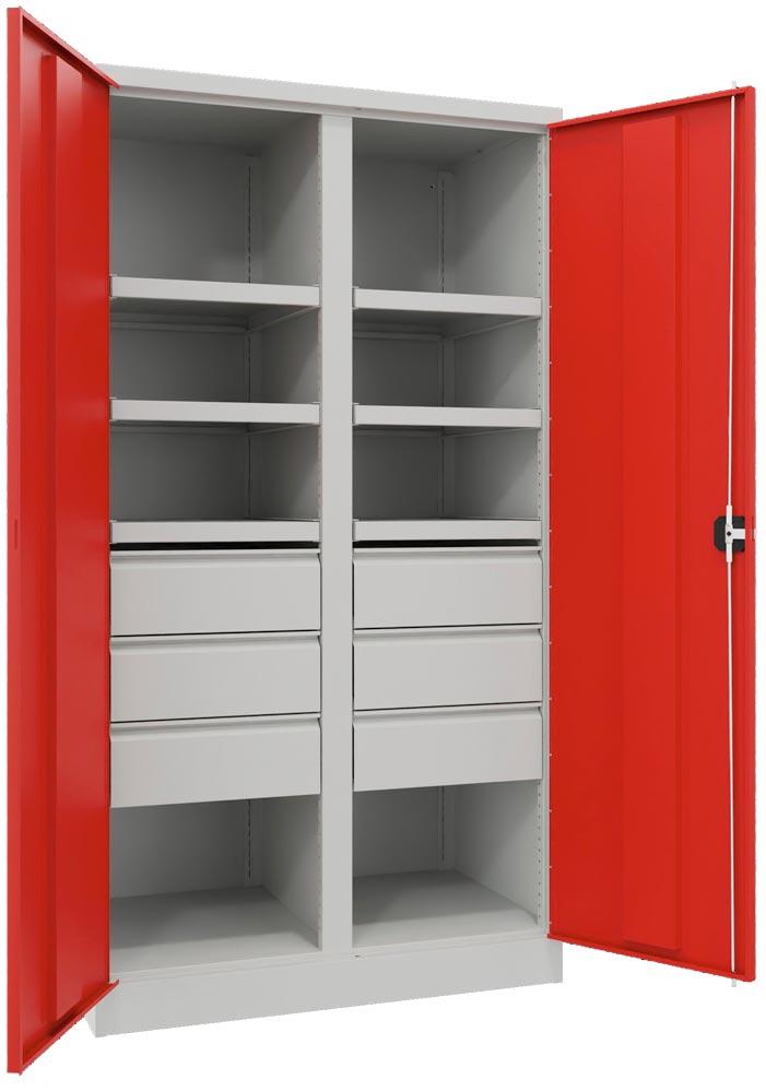 Schwerlastschrank, Vollblechtüren, m. Trennwand, 6 Böden, 200 kg Traglast, 6 Schubl. 175 mm, BxTxH 1040x630x1950 mm, RAL 7035/3000