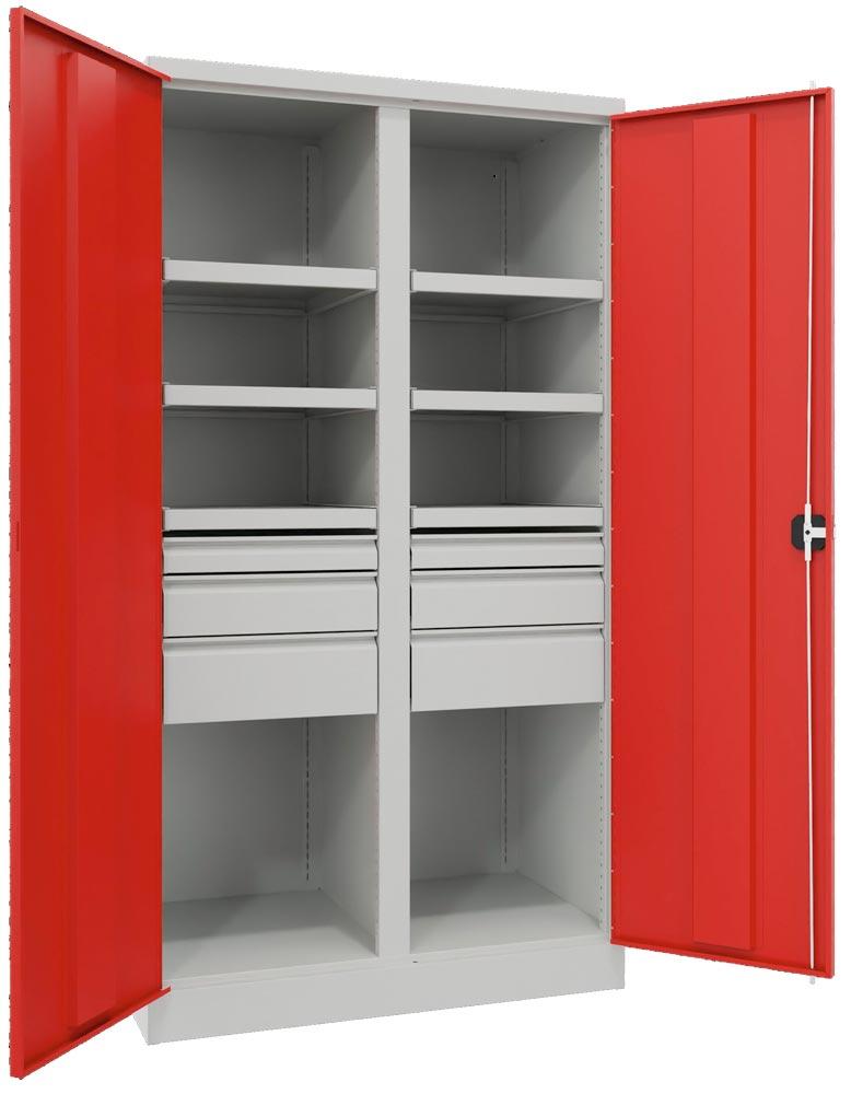 Schwerlastschrank, Vollblechtüren, m. Trennwand, 6 Böden, 200 kg Traglast, Schubl.: 2x75, 2x125, 2x 175 mm, BxTxH 1040x630x1950 mm, RAL 7035/3000