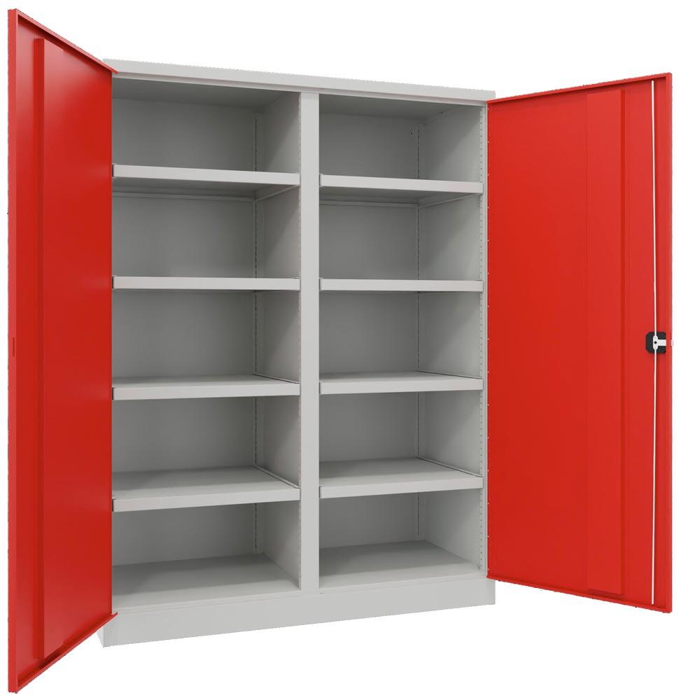 Schwerlastschrank, Vollblechtüren, m. Trennwand, 8 Böden, 200 kg Traglast, BxTxH 1470x 630x1950 mm, RAL 7035/3000