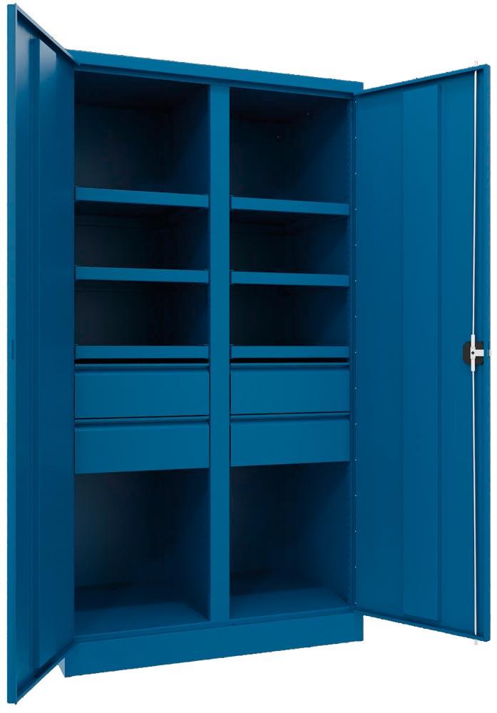 Schwerlastschrank, Vollblechtüren, ohne Trennwand, 3 Böden, 120 kg Traglast, 2 Schubl. 175 mm, BxTxH 1040x630x1950 mm, RAL 5010