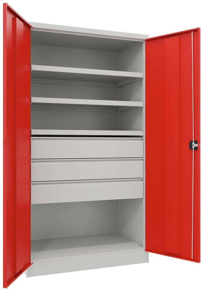 Schwerlastschrank, Vollblechtüren, ohne Trennwand, 3 Böden, 120 kg Traglast, 3 Schubl. 175 mm, BxTxH 1040x630x1950 mm, RAL 7035/3000