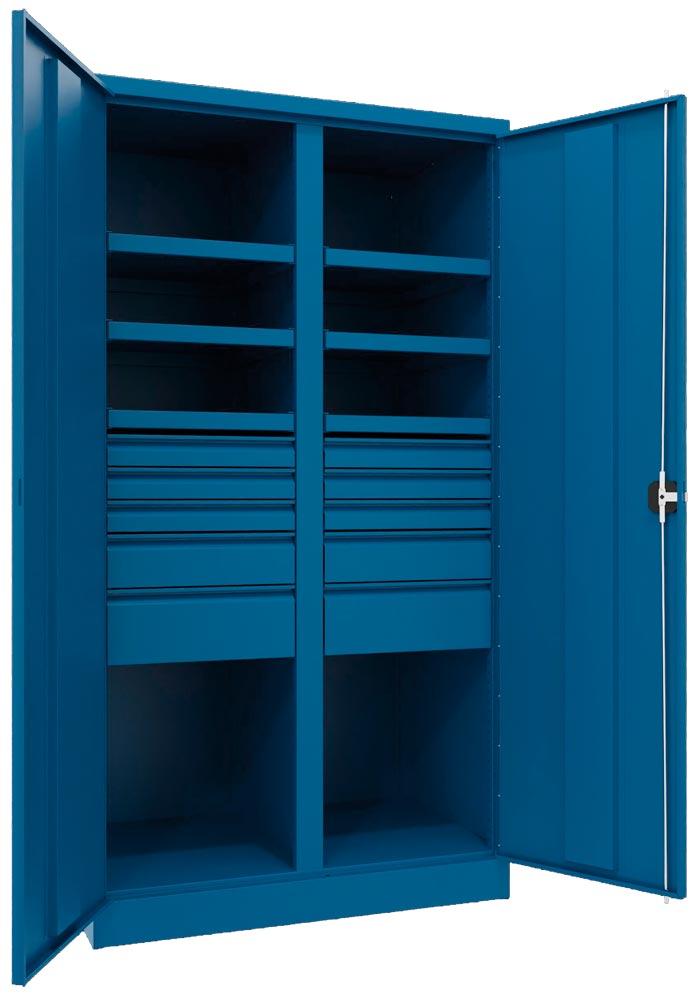 Schwerlastschrank, Vollblechtüren, ohne Trennwand, 3 Böden, 120 kg Traglast, Schubl.: 3x75, 1x125, 1x175 mm, BxTxH 1040x630x1950 mm, RAL 5010