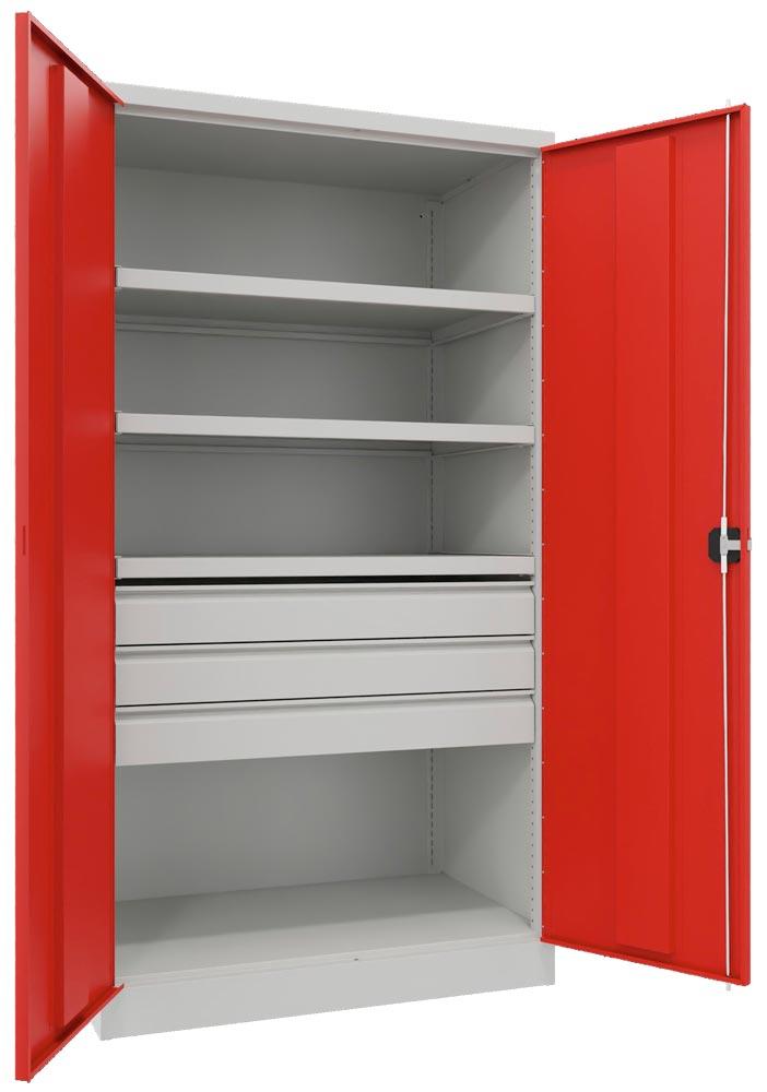 Schwerlastschrank, Vollblechtüren, ohne Trennwand, 3 Böden, 200 kg Traglast, 3 Schubl. 125 mm, BxTxH 1040x630x1950 mm, RAL 7035/3000