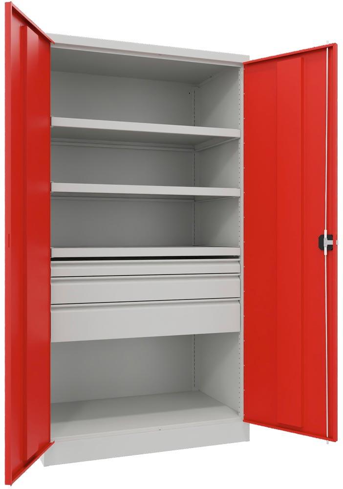 Schwerlastschrank, Vollblechtüren, ohne Trennwand, 3 Böden, 200 kg Traglast, Schubl.: 1x75, 1x125, 1x 175 mm, BxTxH 1040x630x1950 mm, RAL 7035/3000