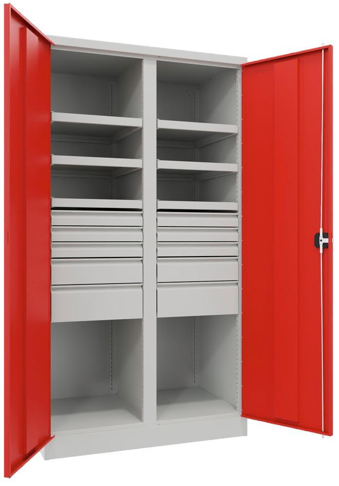 Schwerlastschrank, Vollblechtüren, ohne Trennwand, 3 Böden, 200 kg Traglast, Schubl.: 3x75, 1x125, 1x 175 mm, BxTxH 1040x630x1950 mm, RAL 7035/3000
