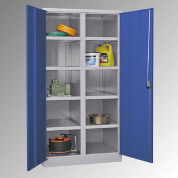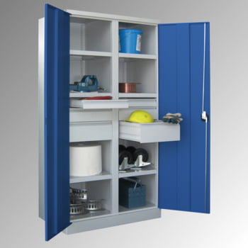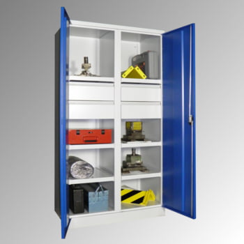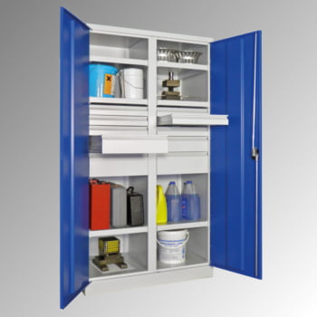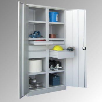 Schwerlastschrank - Vollblechtüren - Trennwand - 6 Böden - 8 Schubladen - 1.950x1.040x630 mm (HxBxT) - lichtgrau