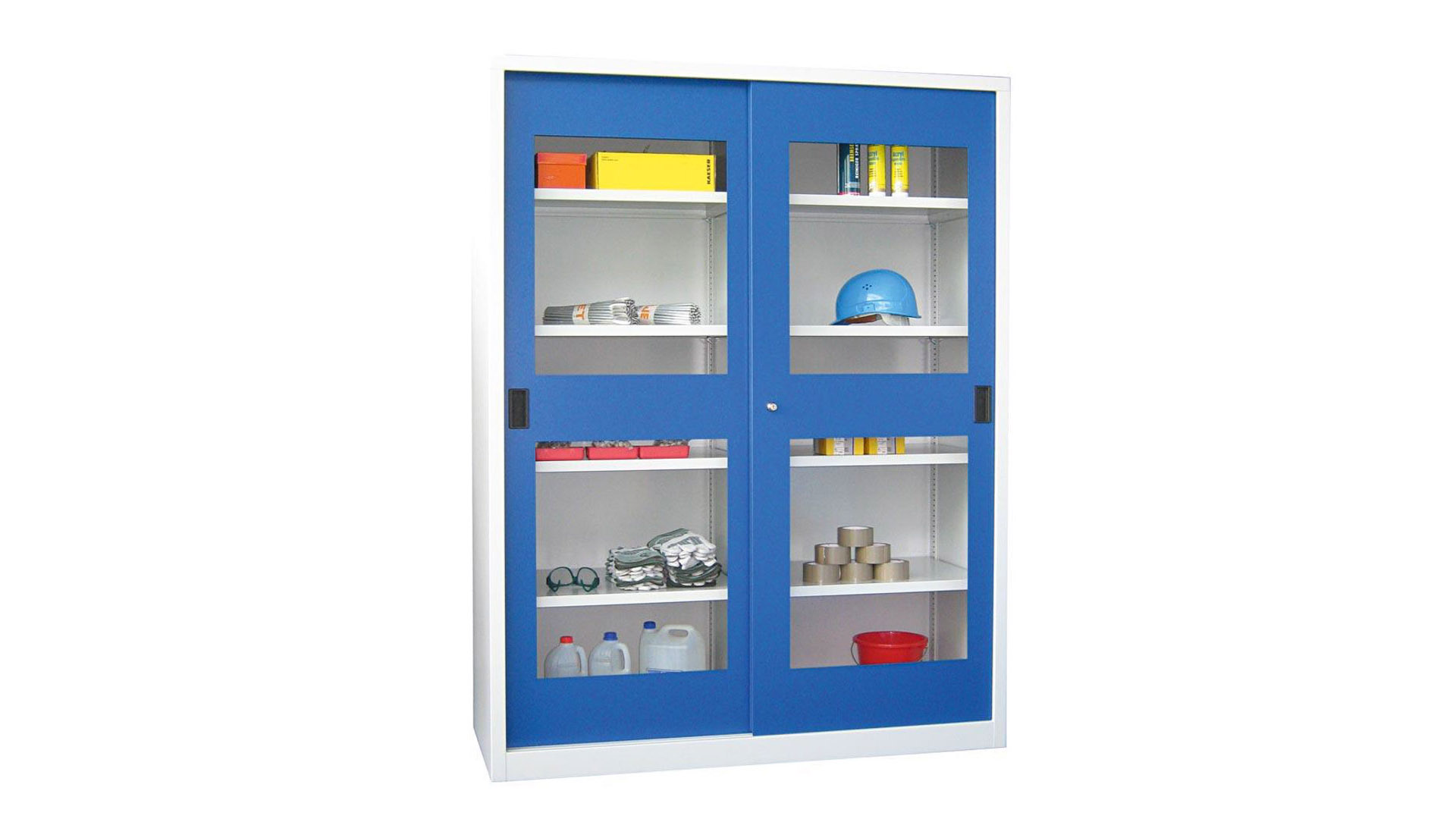 Die von uns angebotenen Schränke sind in Deutschland hergestellte Metallschränke zur Aufbewahrung von Ordnern, Werkzeug, Putzmitteln oder anderer Arbeitsutensilien. Die Schiebetürenschränke sind mit einem Zylinderschloss ausgestattet und haben Vollblech- oder Sichtfenstertüren.