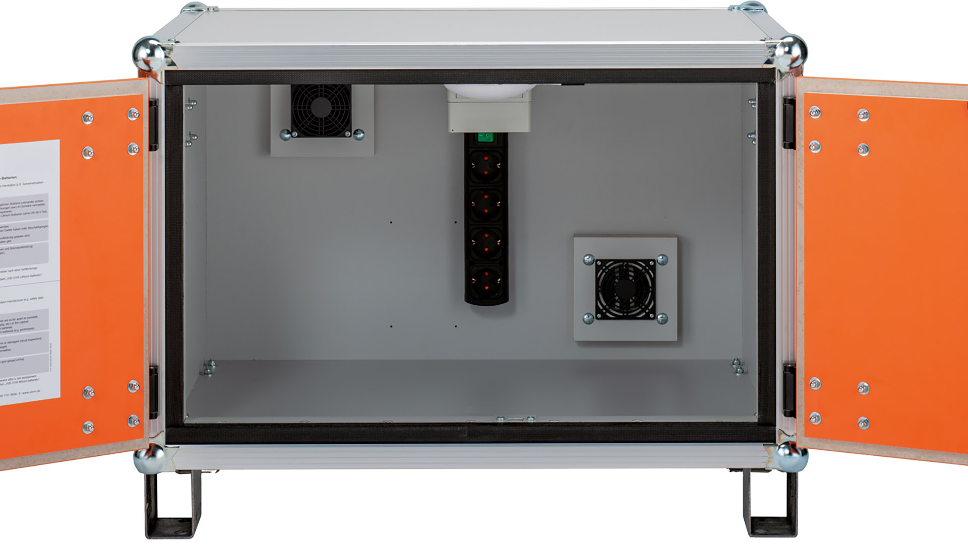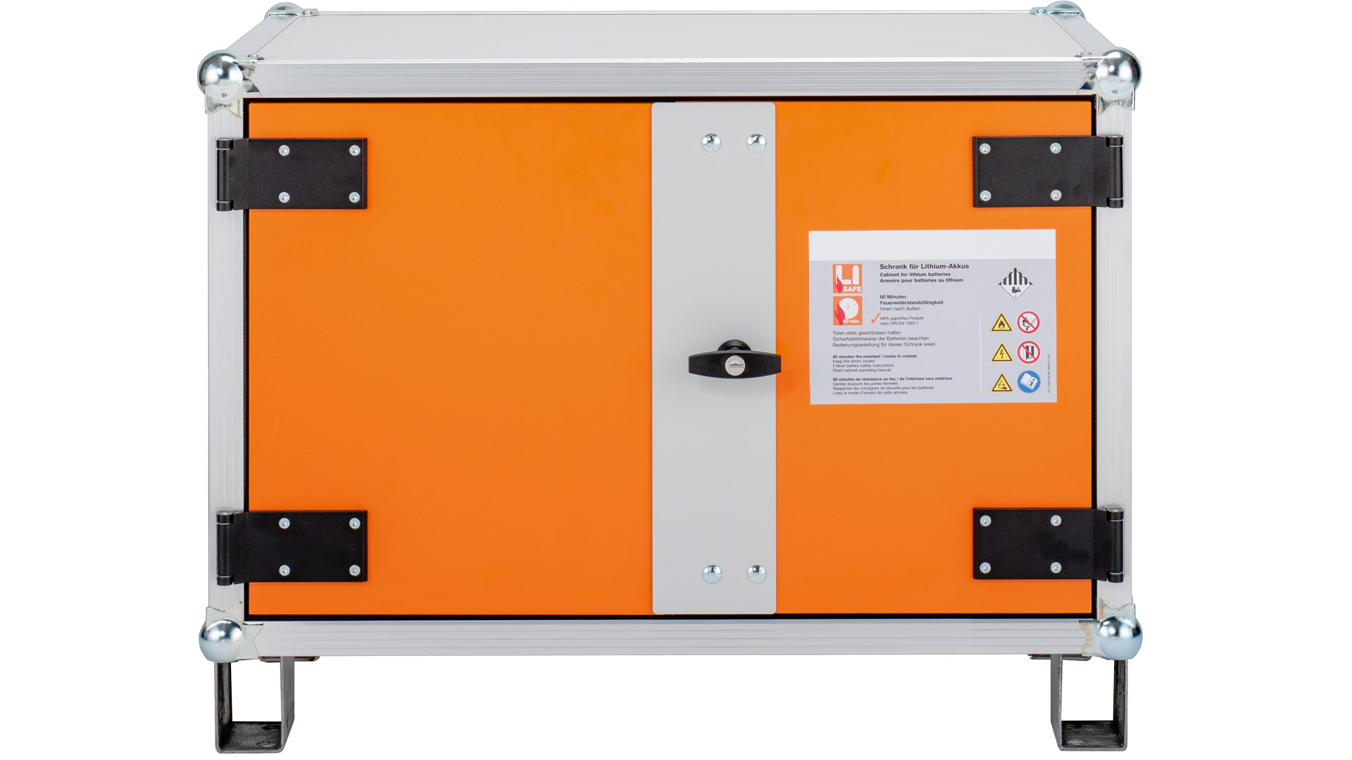 Akku-Ladeschrank, Basis, Rauchmelder, techn. Lüftung, BxTxH 800x660x620 mm, Tür orange, Stapelfüße, Korpus grau
