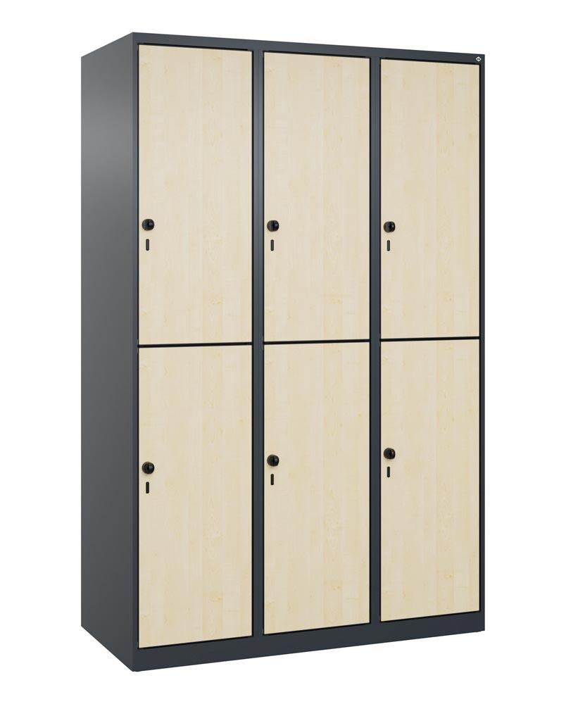 Fächerschrank, doppelstöckig, bodenstehend, 3x2 Fächer, Abt.B 400 mm, BxTxH 1200x500x1850 mm, HPL-Dekorfront, RAL 7016/Dekor Ahorn