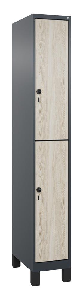 Fächerschrank, doppelstöckig, Füße, 1x2 Fächer, Abt.B 300 mm, BxTxH 300x500x1950 mm, HPL-Dekorfront, RAL 7016/Dekor Sen Esche