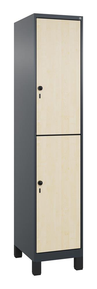 Fächerschrank, doppelstöckig, Füße, 1x2 Fächer, Abt.B 400 mm, BxTxH 400x500x1950 mm, HPL-Dekorfront, RAL 7016/Dekor Ahorn