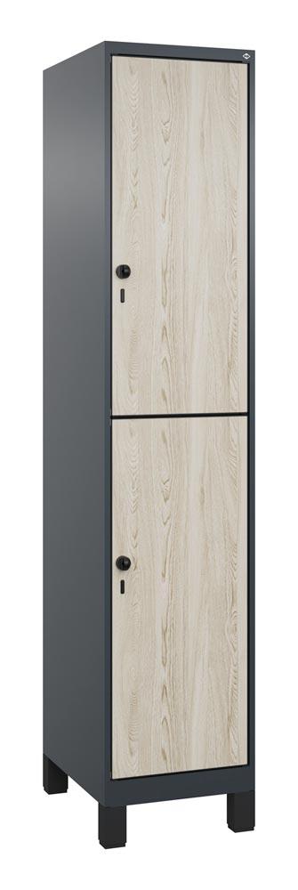 Fächerschrank, doppelstöckig, Füße, 1x2 Fächer, Abt.B 400 mm, BxTxH 400x500x1950 mm, HPL-Dekorfront, RAL 7016/Dekor Sen Esche