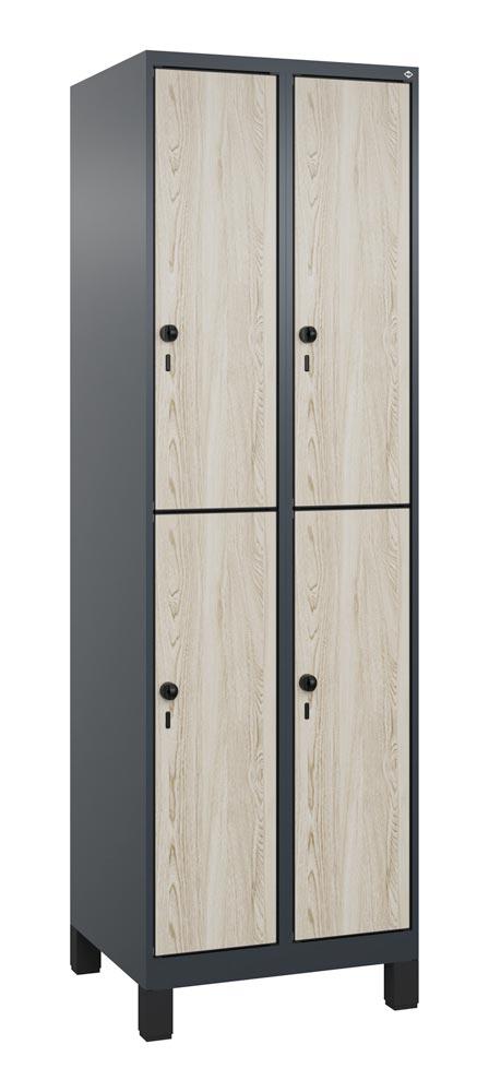 Fächerschrank, doppelstöckig, Füße, 2x2 Fächer, Abt.B 300 mm, BxTxH 600x500x1950 mm, HPL-Dekorfront, RAL 7016/Dekor Sen Esche