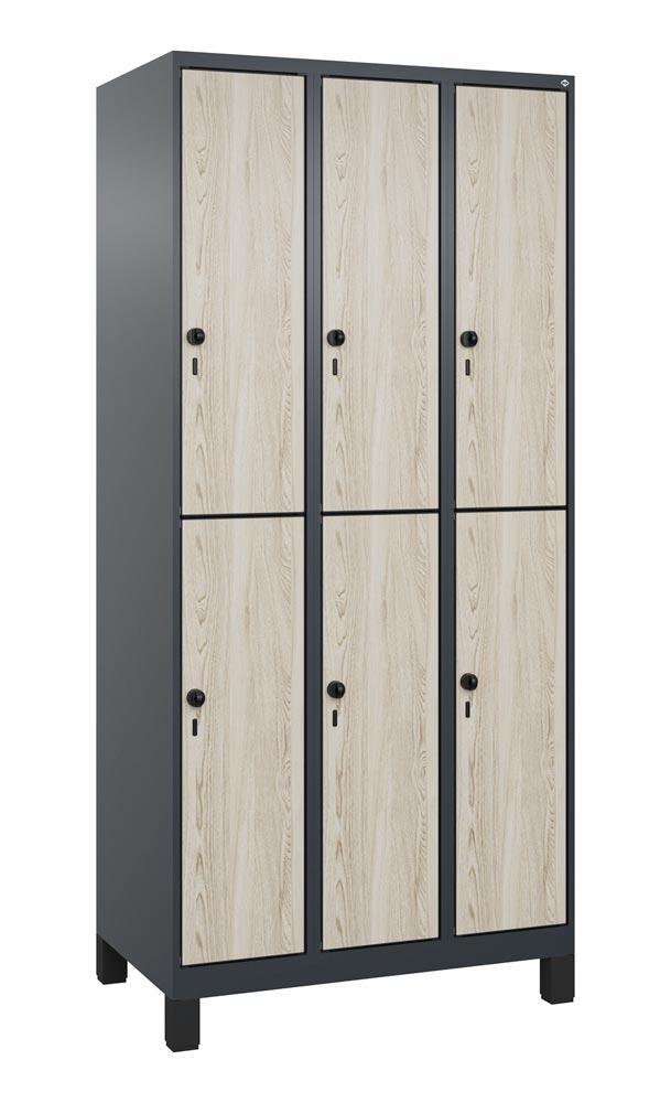 Fächerschrank, doppelstöckig, Füße, 3x2 Fächer, Abt.B 300 mm, BxTxH 900x500x1950 mm, HPL-Dekorfront, RAL 7016/Dekor Sen Esche