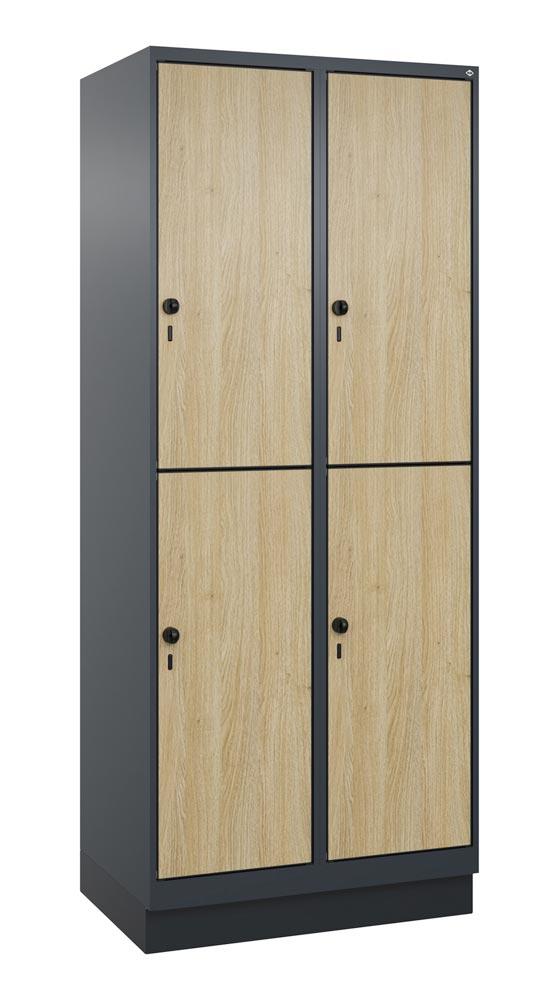Fächerschrank, doppelstöckig, Sockel, 2x2 Fächer, Abt.B 400 mm, BxTxH 800x500x1950 mm, HPL-Dekorfront, RAL 7016/Dekor Eiche Sereno
