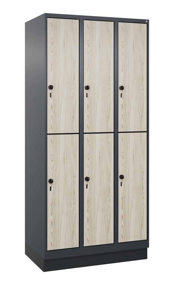 Fächerschrank, doppelstöckig, Sockel, 3x2 Fächer, Abt.B 300 mm, BxTxH 900x500x1950 mm, HPL-Dekorfront, RAL 7016/Dekor Sen Esche