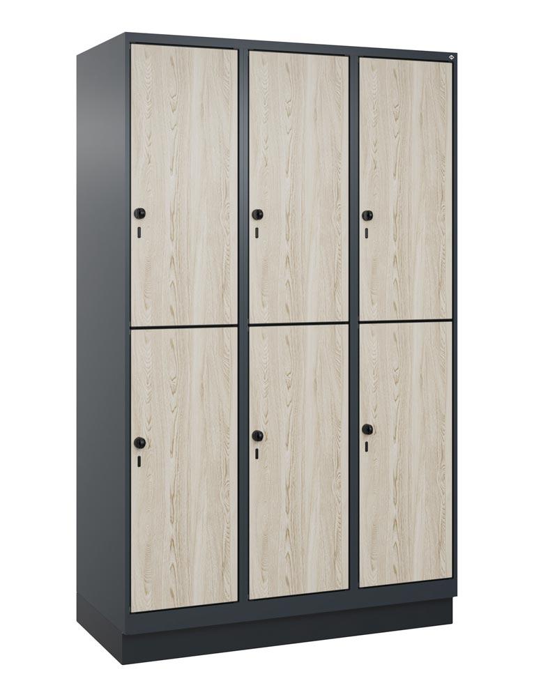 Fächerschrank, doppelstöckig, Sockel, 3x2 Fächer, Abt.B 400 mm, BxTxH 1200x500x1950 mm, HPL-Dekorfront, RAL 7016/Dekor Sen Esche