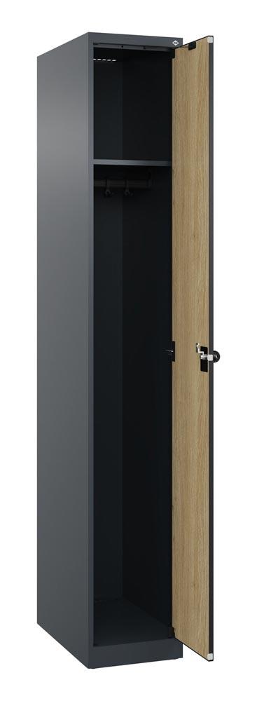 Garderobenschrank, bodenstehend, 1 Abt., Abt.B 300 mm, BxTxH 300x500x1850 mm, HPL-Dekorfront, RAL 7016/Dekor Eiche Sereno