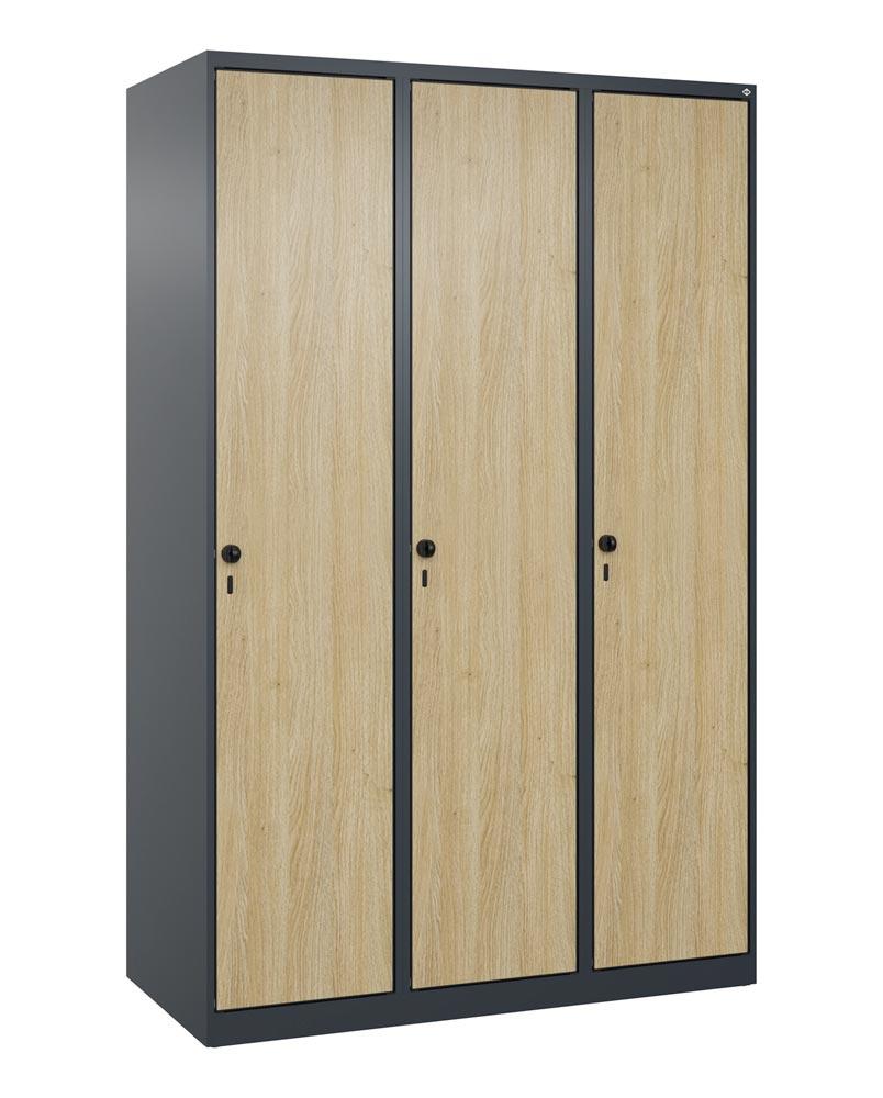 Garderobenschrank, bodenstehend, 3 Abt., Abt.B 400 mm, BxTxH 1200x500x1850 mm, HPL-Dekorfront, RAL 7016/Dekor Eiche-Sereno