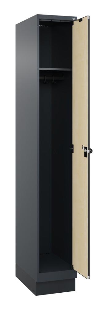 Garderobenschrank, Sockel, 1 Abt., Abt.B 300 mm, BxTxH 300x500x1950 mm, HPL-Dekorfront, RAL 7016/Dekor Ahorn