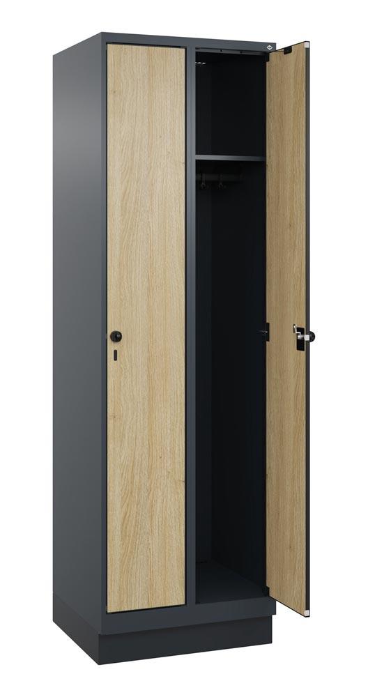 Garderobenschrank, Sockel, 2 Abt., Abt.B 300 mm, BxTxH 600x500x1950 mm, HPL-Dekorfront, RAL 7016/Dekor Eiche-Sereno