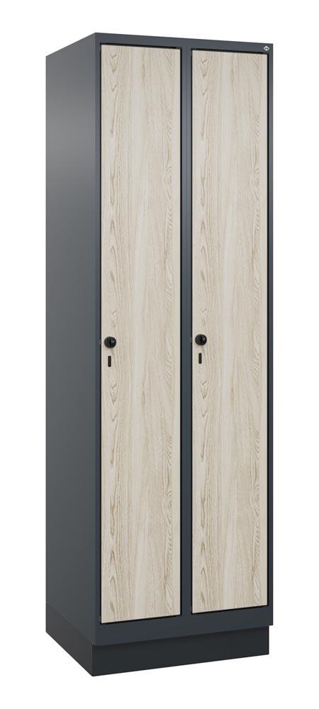 Garderobenschrank, Sockel, 2 Abt., Abt.B 300 mm, BxTxH 600x500x1950 mm, HPL-Dekorfront, RAL 7016/Dekor Sen-Esche