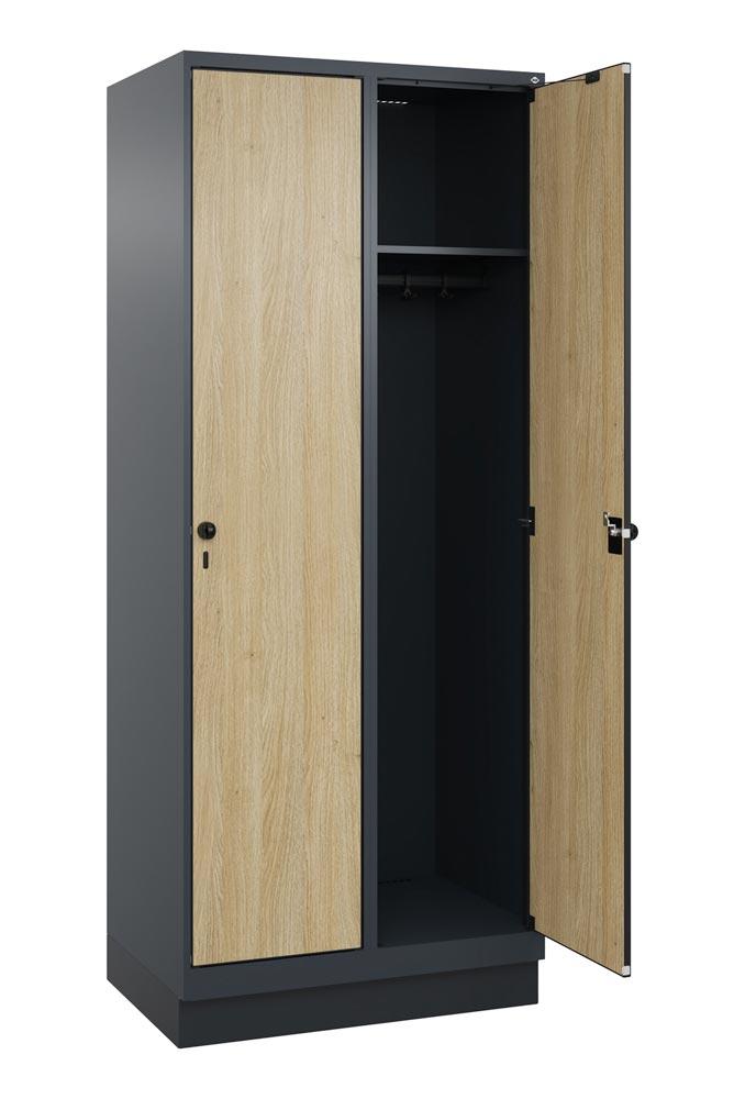 Garderobenschrank, Sockel, 2 Abt., Abt.B 400 mm, BxTxH 800x500x1950 mm, HPL-Dekorfront, RAL 7016/Dekor Eiche-Sereno
