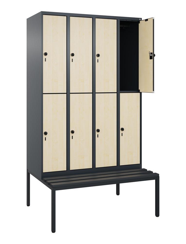 Garderobenschrank mit Sitzbank, BxTxH 1200x500/815x2120 mm, 4x2 Fächer, Abt.B 300 mm, doppelstöckig, Kunststoffleisten, RAL 7016/Eiche