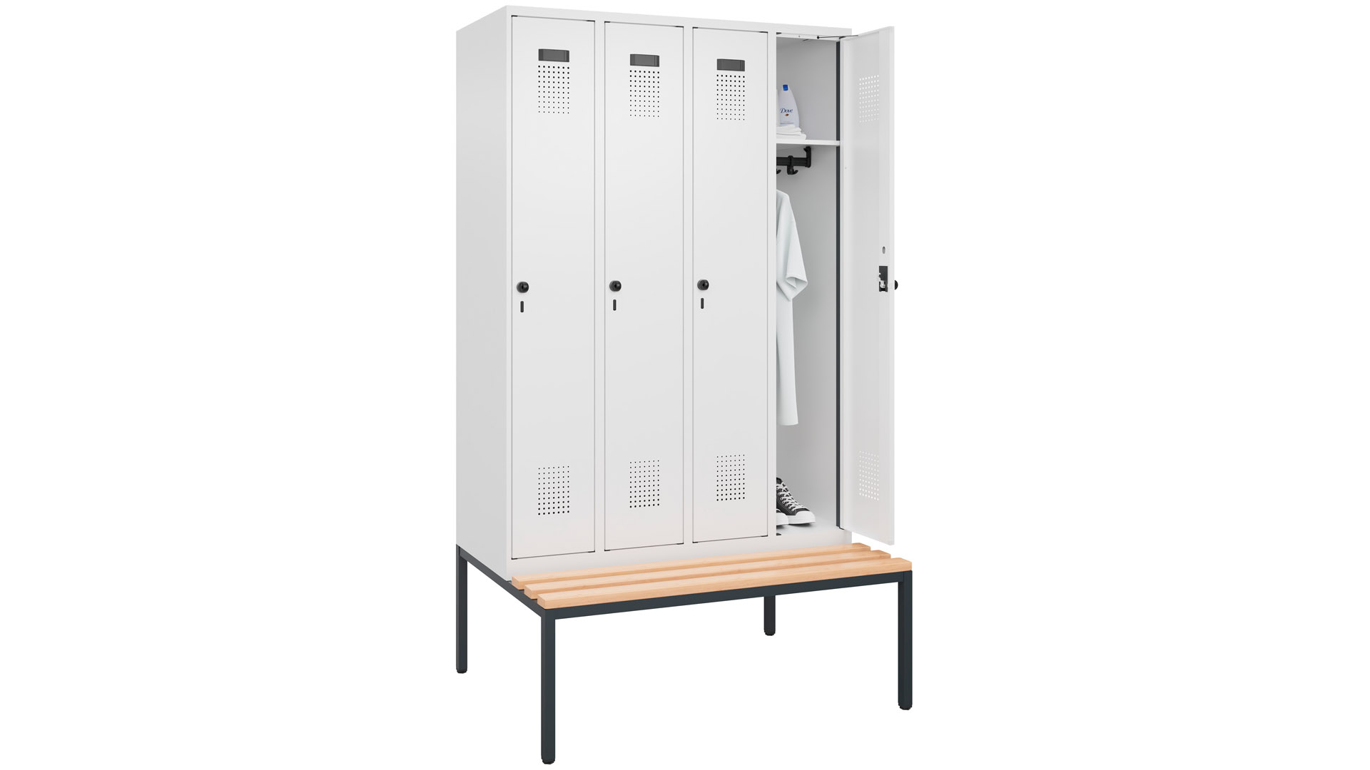 ∙ Stabile Stahlkonstruktion mit hochwertiger Einbrennbeschichtung ∙ Verstärkte Türen mit Anschlagsdämpfer für geräuscharmes Schließen ∙ Designlochbilder für optimale Belüftung ∙ Stabile Garderobenstange mit 3 verdrehsicherem Doppel-Schiebehaken ∙ Glatter Abteilboden für einfaches Auskehren ∙ Fußteil und Schrankboden serienmäßig verzinkt für erhöhten Korrisionschutz ∙ Innovative Kant- und Biege-Geometrien, sowie Materialdopplungen ∙ Fest verschweißter Ablageboden pro Abteil ∙ Optimierte Lüftungsöffnungen im Abteil · Pro Abteil 1 Ablageboden · Korpus T 500 mm · Wahlweise 2-, 3- oder 4 Abteile · Sitzbankgestell H 420 mm · Sitzhöhe 450 mm, Sitztiefe 315 mm · Bank und Schrank werden zur einfachen Selbstmontage separat geliefert · Schuhroste sowie Kunststoff-SItzleisten in schwarzgrau oder weiß sind auf Anfrage erhältlich