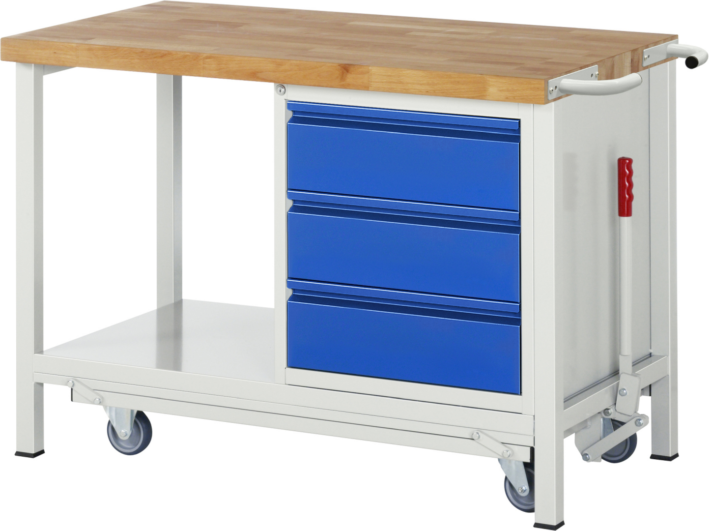 Absenkbare Werkbank - Modell 8157 BASIC schwarz-rot, BxTxH 1250x700x880 mm, Buche-Massiv Arbeitsplatte 40 mm, 3 Schubladen mit Auszug 90 %