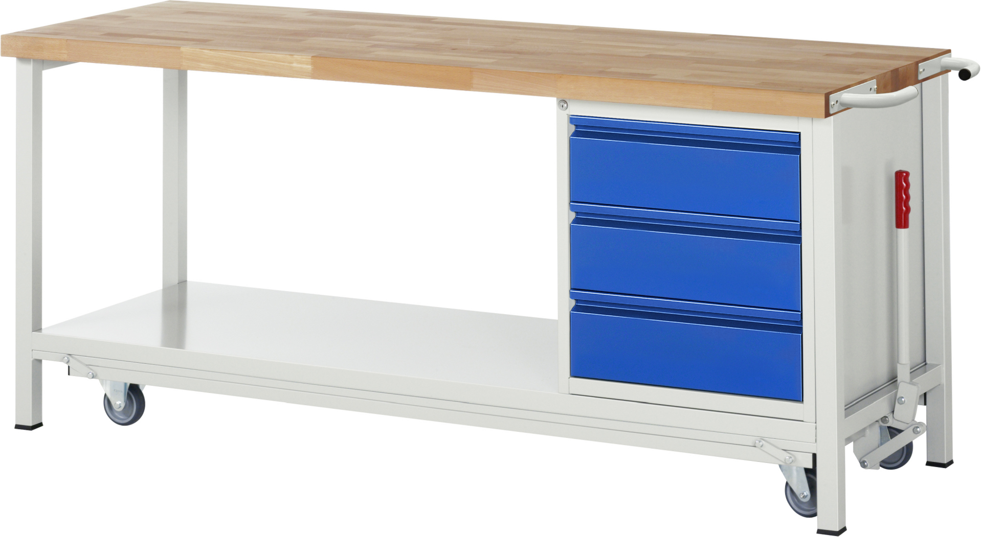 Absenkbare Werkbank - Modell 8157 BASIC schwarz-rot, BxTxH 2000x700x880 mm, Buche-Massiv Arbeitsplatte 40 mm, 3 Schubladen mit Auszug 90 %