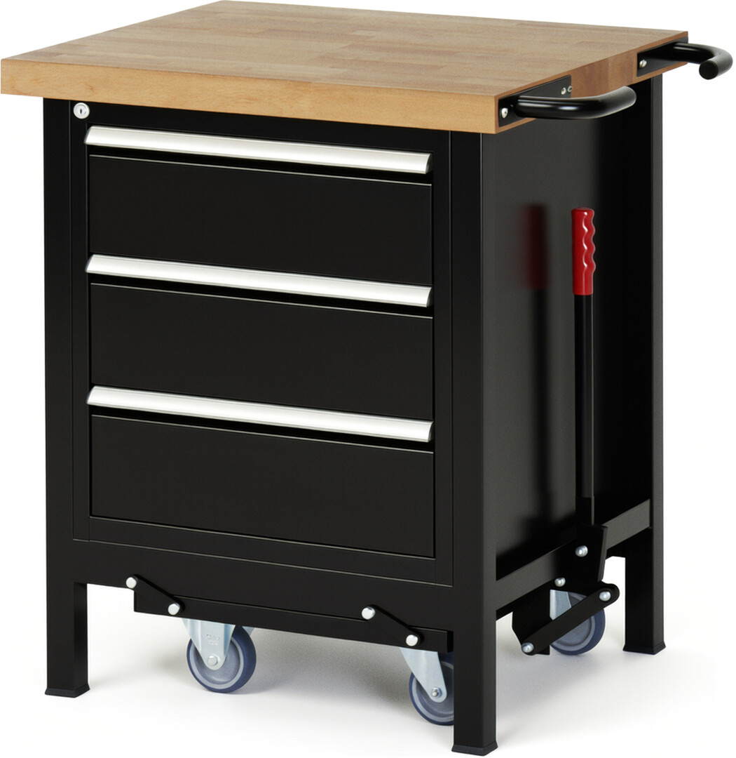 Absenkbare Werkbank Modell 8157 schwarz, BxTxH 750x700x880 mm, Buche-Massiv Arbeitsplatte 40 mm, 3 Schubladen mit Vollauszug 100 % und SoftClosing