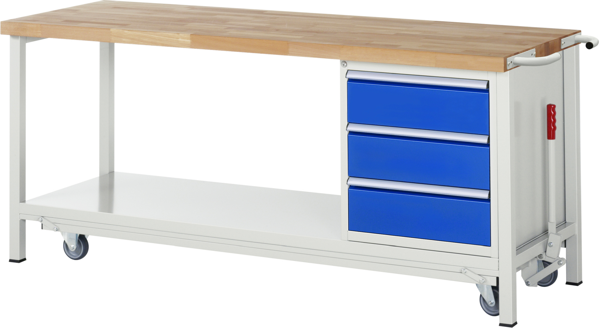 - Robustes Schweißgestell mit vier Füßen – bestehend aus zwei Fußpaaren aus Profil-Stahlrohr (45 x 45 x 2 mm). Mit Tiefenverstrebungen oben und unten für erhöhte Standfestigkeit. Abschlusselemente an den unteren Gestellfüßen inklusive Anti-Rutsch-Noppen sorgen für einen festen und sicheren Stand. Untergebautes Fahrgestell mit Exzenterhebel auf der rechten Seite. Die Bedienung ist bis zu einer maximalen Zuladung von 300 kg möglich. Der Exzenterhebel ermöglicht das Ein- und Ausfahren des Fahrgestells. Fahrgestell mit zwei Bock- und zwei Lenkrollen. Rollendurchmesser: 100 mm, Bauhöhe: 125 mm. Die spurlosen Rollen bestehen aus thermoplastischem Gummi (85 ° Shore), der Radkörper aus robustem Polypropylen. Montage der Rollen: Bockrollen links, Lenkrollen rechts. Befestigung erfolgt über stabile Radplatten. Ablageboden unten (Tiefe 650 mm hinten bündig mit Systemunterbau, Fachhöhe 620 mm).