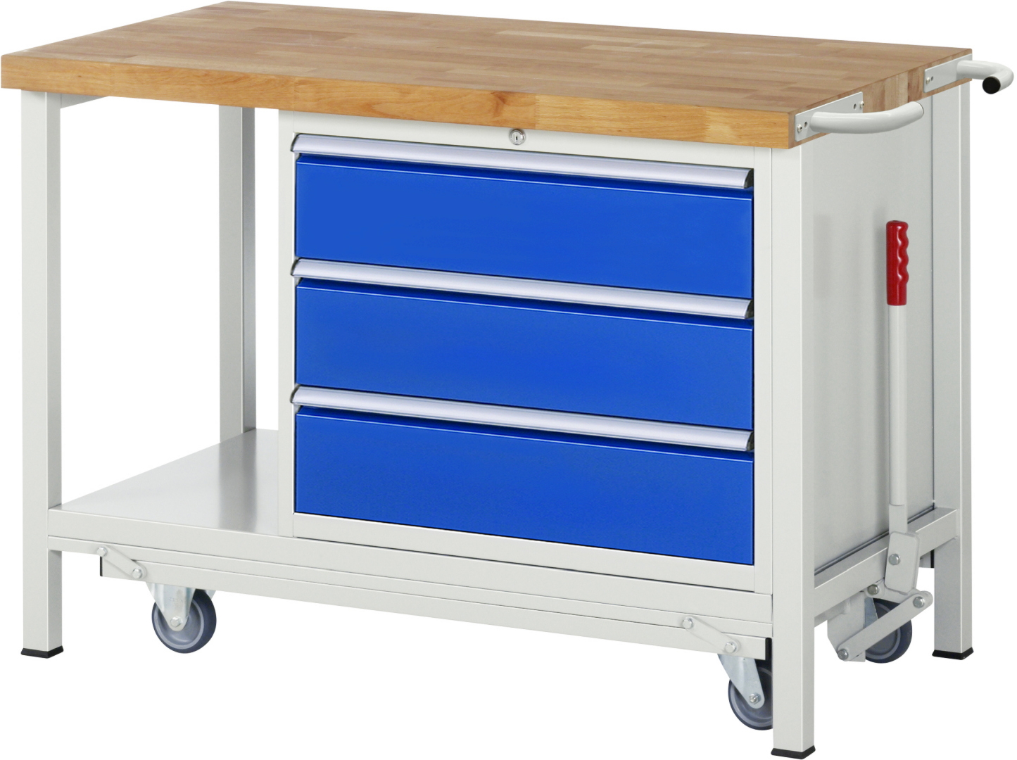 Absenkbare Werkbank Modell 8257 schwarz-rot, BxTxH 1250x700x880 mm, Buche-Massiv Arbeitsplatte 40 mm, 3 Schubladen mit Vollauszug 100 % und SoftClosing