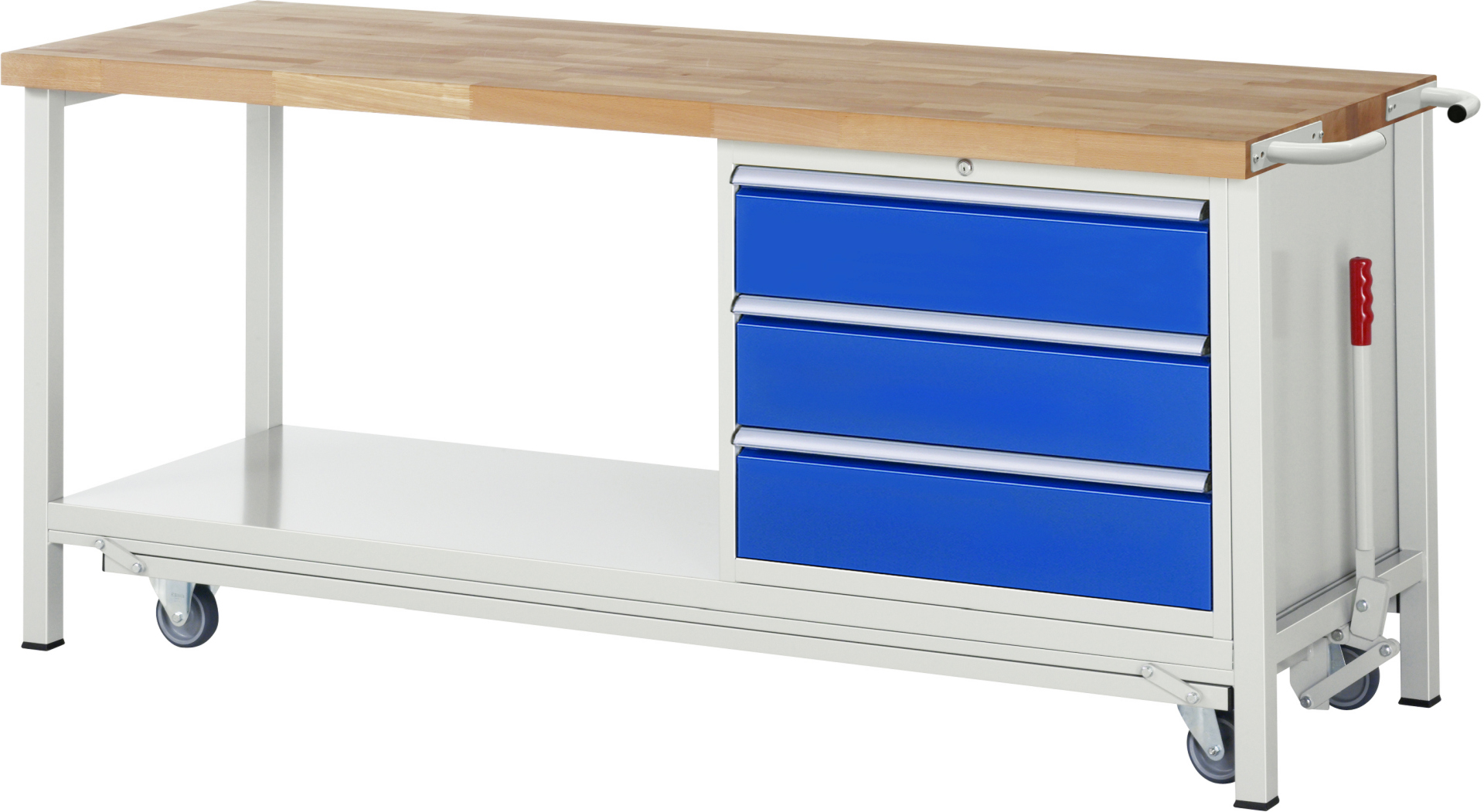 Absenkbare Werkbank Modell 8257 schwarz-rot, BxTxH 2000x700x880 mm, Buche-Massiv Arbeitsplatte 40 mm, 3 Schubladen mit Vollauszug 100 % und SoftClosing