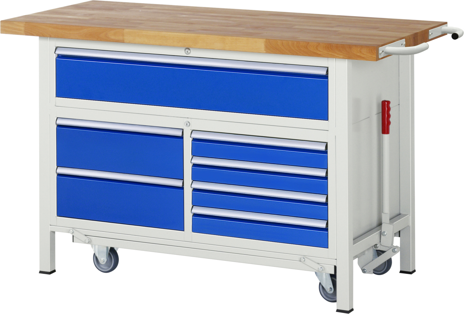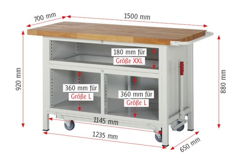 Absenkbare Werkbank Modell 8921 schwarz-rot, BxTxH 1500x700x920 mm, Buche-Massiv Arbeitsplatte 40 mm, 7 Schubladen mit Vollauszug 100 % und SoftClosing
